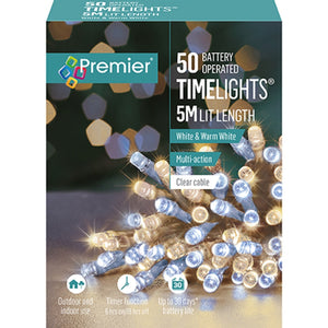 Brighten your indoor and outdoor displays with the Premier 50 White & Warm White LED Lights. Battery-operated for convenient placement without wires, these multi-action lights feature a clear cable and a timer function to simplify your lighting setup. Combining classic white and warm white LEDs, they create a welcoming atmosphere while offering versatile, energy-efficient illumination.